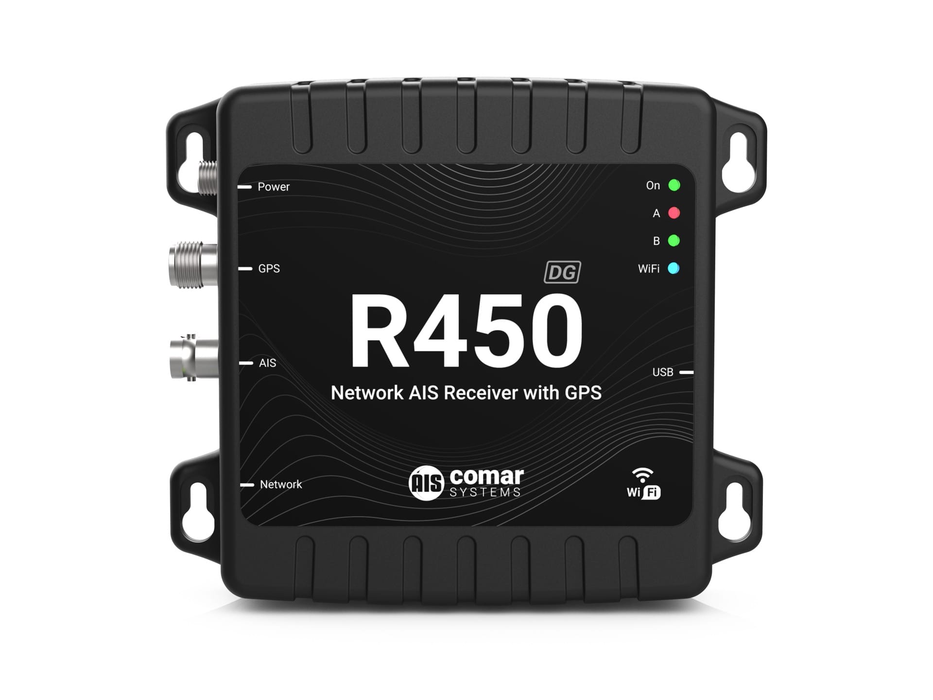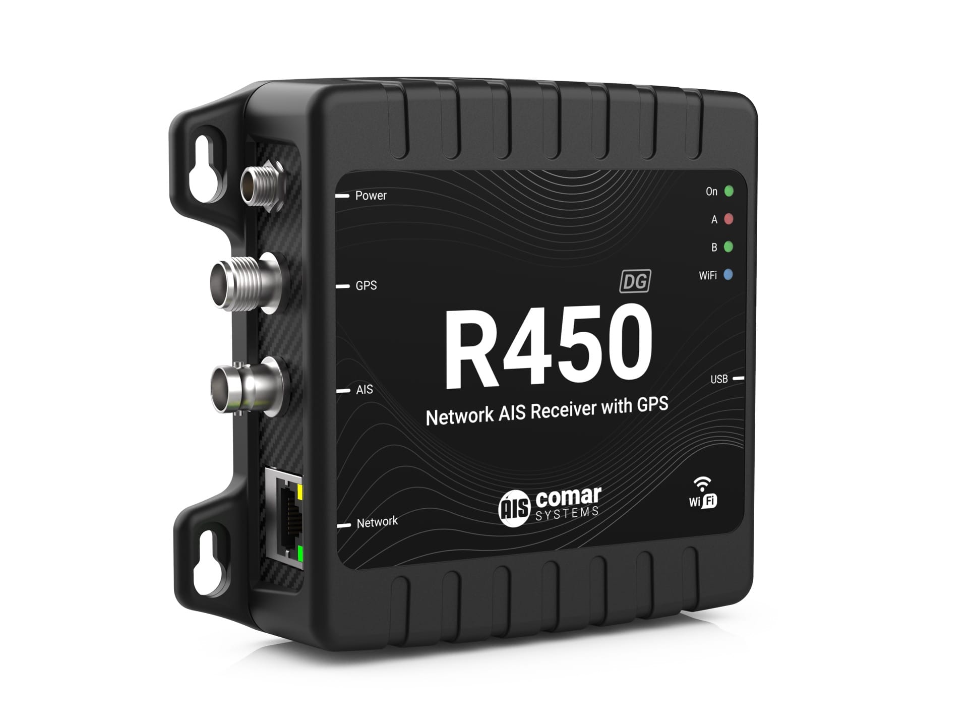 With both Ethernet and built-in Wi-Fi connectivity, the R450-DG streams AIS and GPS data directly to PCs, servers, or mobile devices over wired or wireless networks. It supports local monitoring, sharing data across a network, or sending AIS and GPS data over the Internet to a fixed IP address for centralised display.